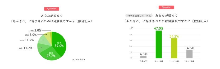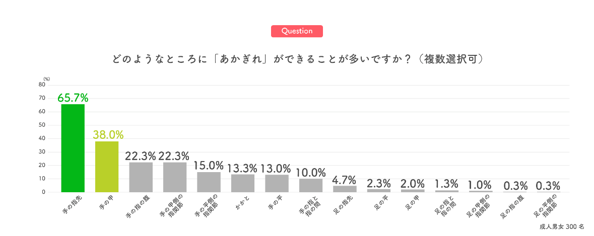 あかぎれに初めて悩まされた年齢を尋ねると、平均25歳という結果に。意外にも、最も多いのは10代以下(39.0%)で、中でも6~10歳の間が多いことが分かりました。あかぎれができやすい場所は、「手の指先」が65.7%で最も多く、次いで「手の甲(38.0%)」となりました。手の指先の中でも「利き手の人差し指(72.5%)」に悩まされていることが多いようです。