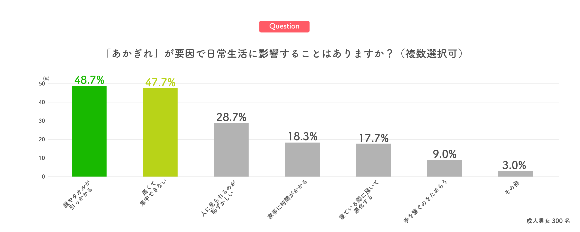 最後に、あかぎれの日常生活への影響を尋ねたところ、「(あかぎれが)服やタオルが引っかかる」48.7%、「痛くて集中できない」(47.7%)が上位にあがりました。また、38.7%の女性が「(あかぎれになったところを)人に見られるのが恥ずかしい」と回答しました。あかぎれは痛みも見た目も気になり、一刻でも早く治したい症状であることが分かりました。
