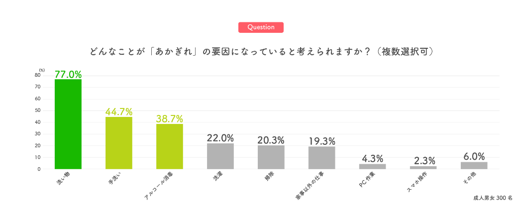 どんなことがあかぎれの要因となっていると思うかを質問したところ、「洗い物」が77.0%で圧倒的でした。水仕事とあかぎれとは、切っても切れないお悩みゴトであることが伺えます。