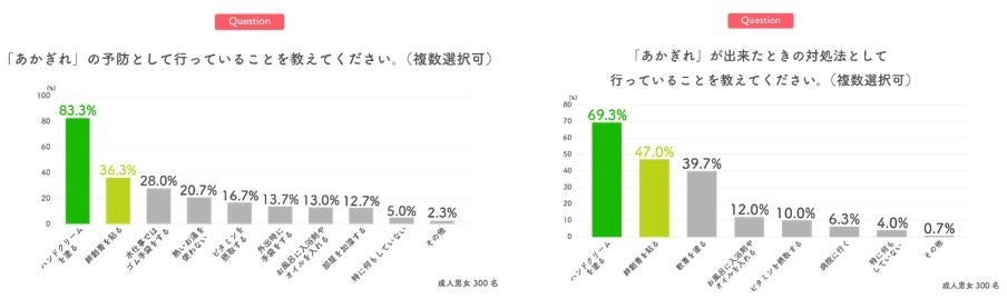 あかぎれの予防法を尋ねたところ、トップ3は「ハンドクリームを塗る」「絆創膏を貼る」「水仕事ではゴム手袋をする」。
