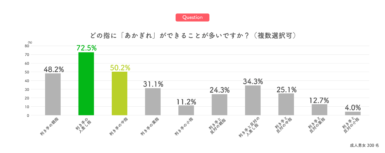 あかぎれは保育園や幼稚園の頃から悩む方が多いですが、赤ちゃんもあかぎれになるケースもあるため、年齢問わず注意が必要です。また、調査結果で、あかぎれのできやすい場所として「手の指先」、中でも利き手の人差し指があがっていますが、これは曲げ伸ばしによって指に負担がかかることによるものです。