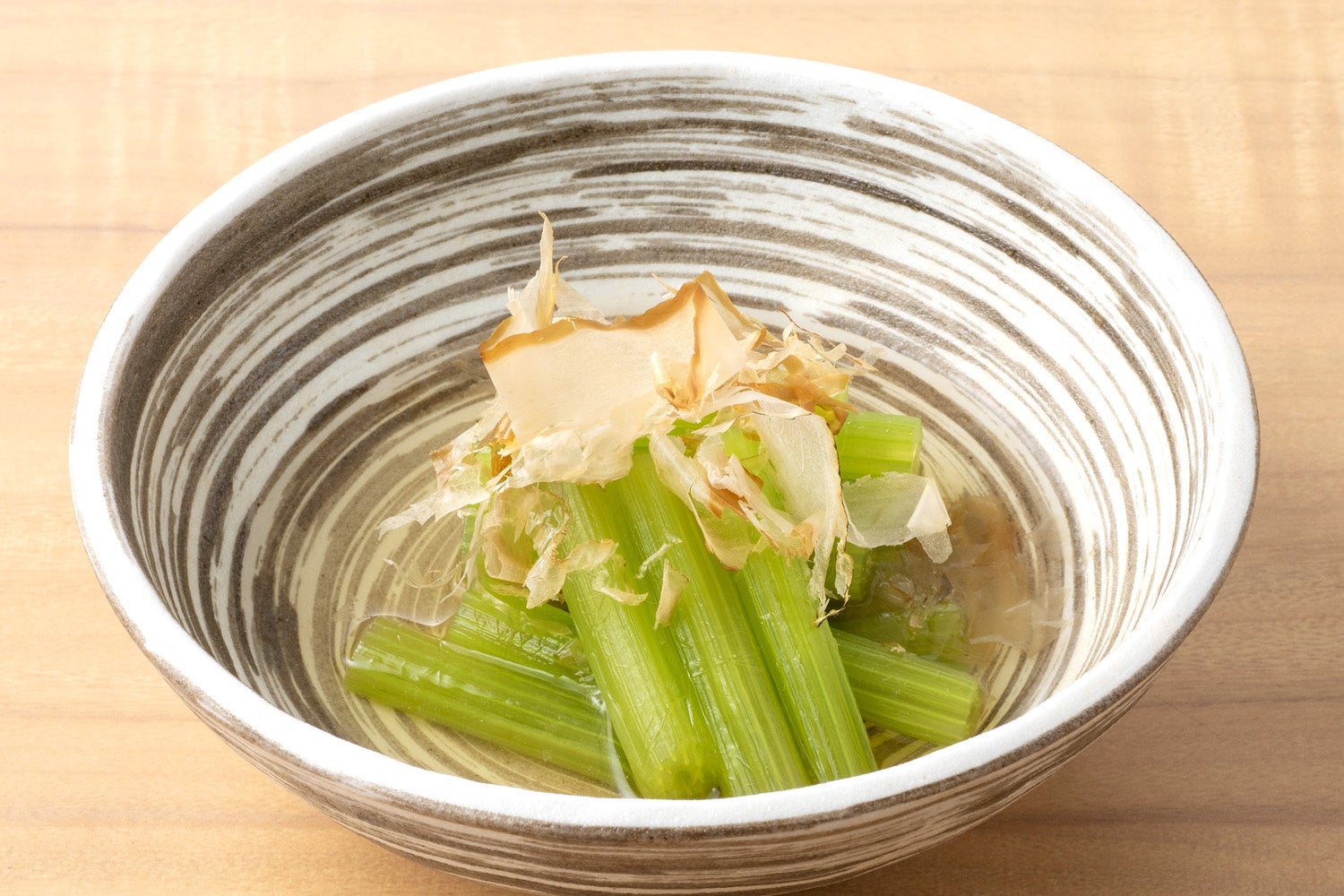 魚の次におすすめしたいのは、古来から初夏の時期に楽しまれるフキ料理。食事を軽やかにしてくれます。板ずりをしてサッと茹で、皮をむいたフキを、自慢の出汁が効いた「ふきの出汁浸し(350円)」にして提供します。フキの香り成分“フキノリド”には、消化を助ける働きもあるとされています。