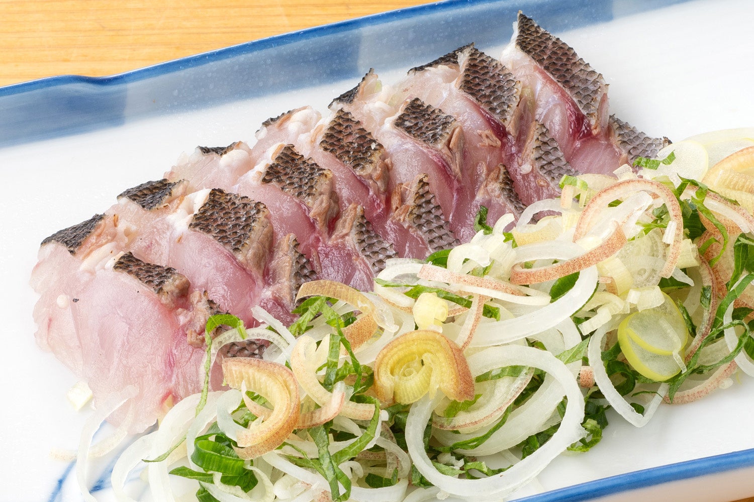 5月のイチオシは、「イサキのたたき(700円)」。初夏に旬を迎える白身魚のイサキは、大分と愛媛に挟まれた豊後水道などで獲れたものを、グループ会社である創業88年の老舗仲卸「米川水産」が目利きし、店舗に直送。皮目が旨いイサキを、香ばしく炙ることで脂がにじみ出て、旨味と甘みが引き立つ一品に。長ねぎやミョウガ、大葉などの薬味をたっぷり乗せ、さっぱりと味わえば、まさに初夏の妙です。