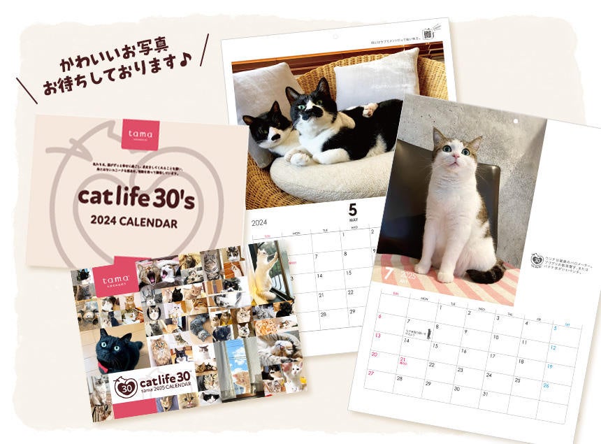 「tamaオリジナルカレンダー」は、全国の皆さまから「ウチの子(猫)」のとびきりかわいく収まった写真を募集して毎年作成するオリジナルカレンダーです。