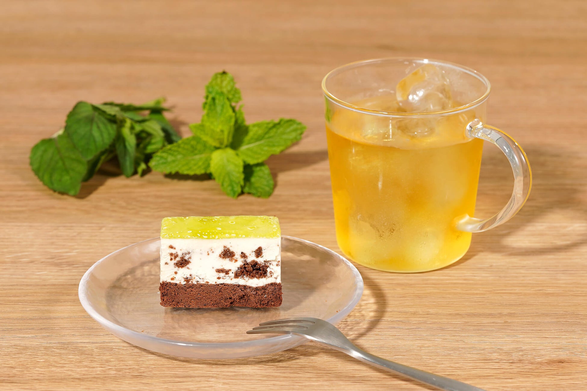 上掛けゼリーにはスペアミントのみを用いることで、爽やかな香りに加え見た目も涼やかにお楽しみいただけます。