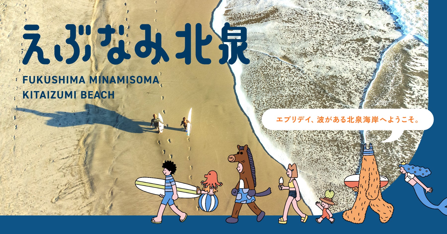 今回公開されたサイト「えぶなみ北泉」では東日本大震災から12年が経つ今年、さらに多くのサーファーの方が北泉を訪れることを目的に、最新情報やイベント告知などを発信していきます。さらに人気イラストレーターの中島ミドリさんに書き起こしていただいた北泉海岸のオリジナルキャラクター「えぶな民(えぶなみん)」も誕生。全国のサーファーの皆さまに楽しんでいただけるようなコンテンツあふれるサイトですので、ぜひご覧ください。