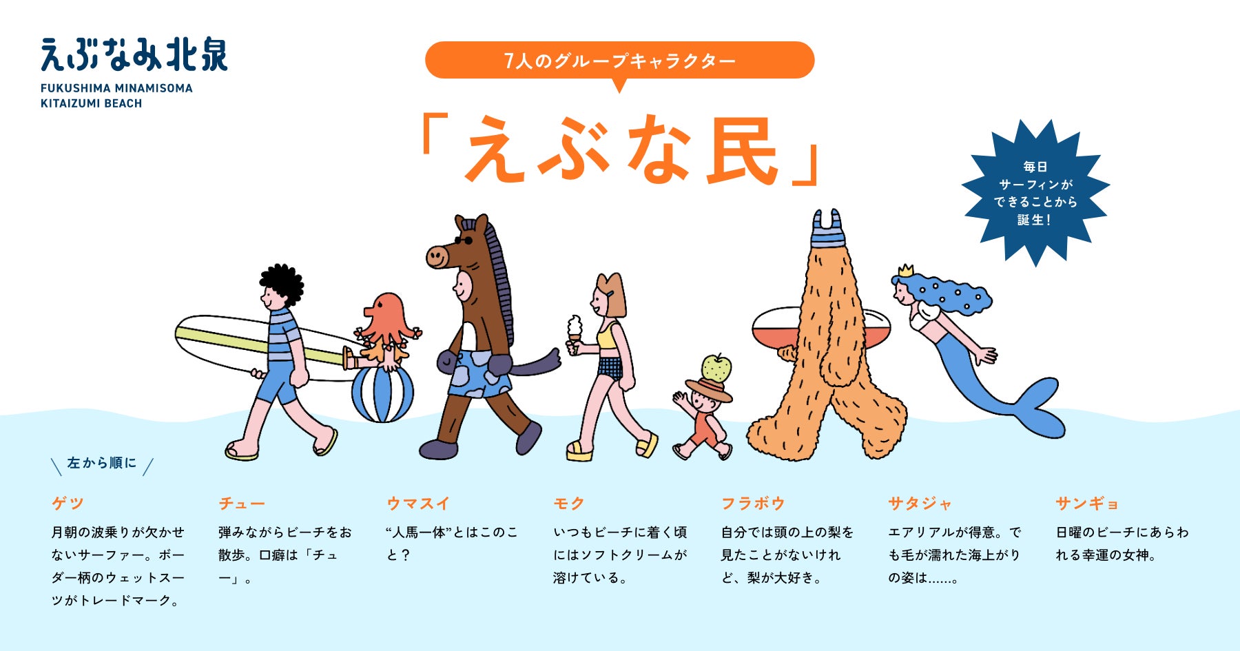 今回北泉海岸の再出発にあたり、県内外の様々な方に親しまれるべくオリジナルキャラクター作りを実施。エブリデイ(毎日)サーフィンができるという北泉海岸の特徴になぞらえ、七曜の名前がついた7人組のキャラクターを、イラストレーターの中島ミドリさんが北泉海岸完全オリジナルで描き起こし。中島ミドリさん独自の世界観によって、個性豊かで愛らしい7人の「えぶな民」が誕生しました。