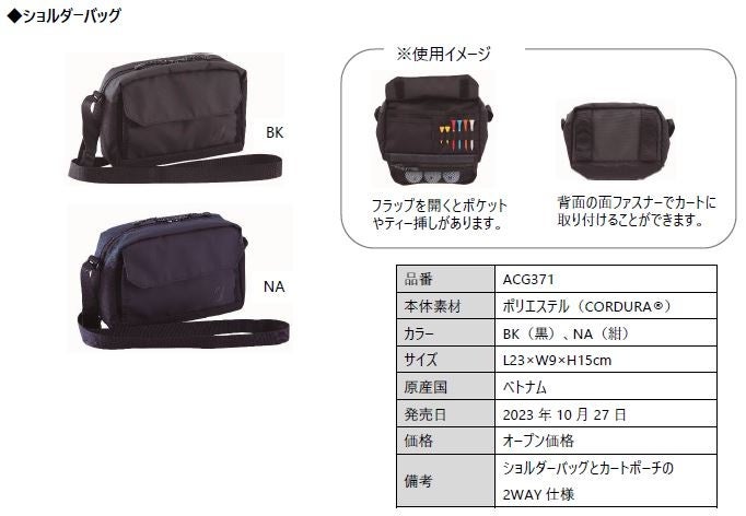 機能面では、ボストンバッグとトートバッグには「シューズインポケット付」、ショルダーバッグはカートポーチとしても使用できる2WAY仕様、ボールポーチには「ティー挿し付」等、ゴルファーにうれしい便利な機能をアイテムごとに搭載しています。