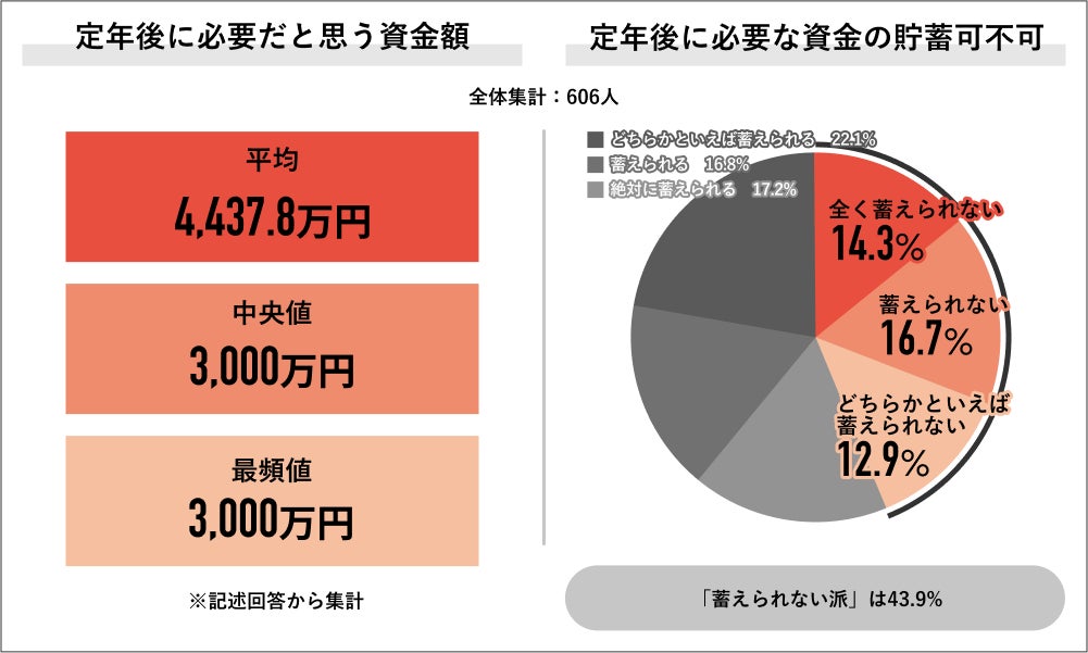 回答者全体の606人に定年後に必要だと思う資金額を聞くと、平均が4,437.8万円、中央値が3,000万円、最頻値が3,000万円となりました。定年後に必要な資金の貯蓄可否については、「蓄えられない派」が43.9%で、内訳は「全く蓄えられない」14.3%、「蓄えられない」16.7%、「どちらかといえば蓄えられない」12.9%でした。