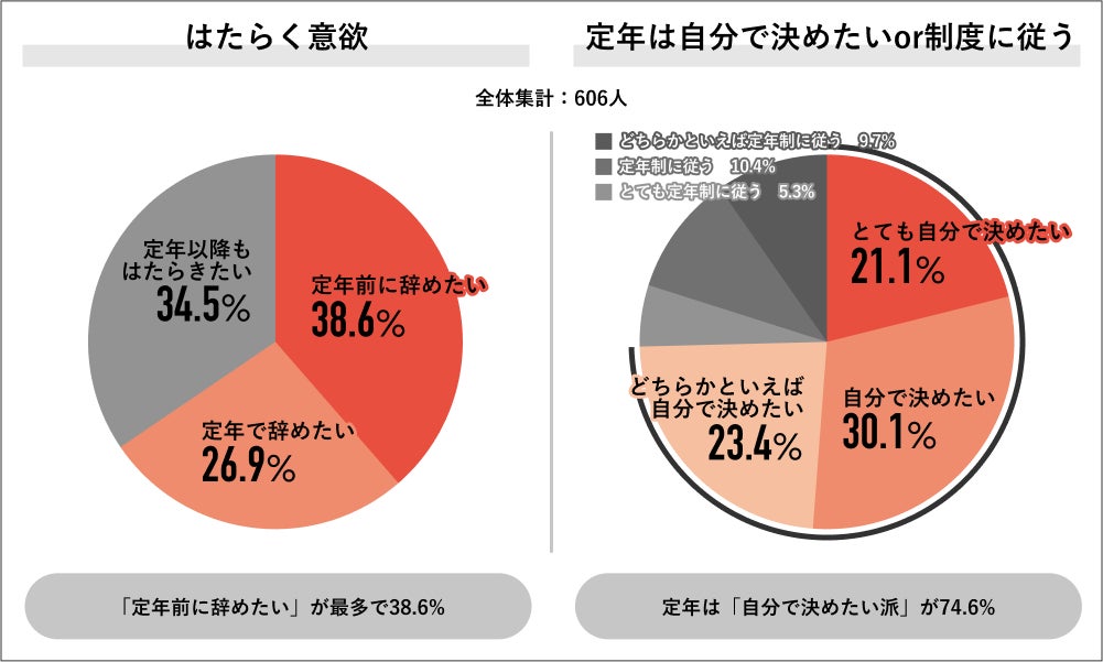 回答者全体の606人にはたらく意欲を聞くと、「定年前に辞めたい派」が38.6%で最多となり、「定年以降もはたらきたい」は34.5%、「定年で辞めたい」は26.9%でした。また、「定年は自分で決めたい」か「制度に従う」かについては「自分で決めたい派」が74.6%で過半数を占め、内訳は「とても自分で決めたい」21.1%、「自分で決めたい」30.1%、「どちらかといえば自分で決めたい」23.4%でした。