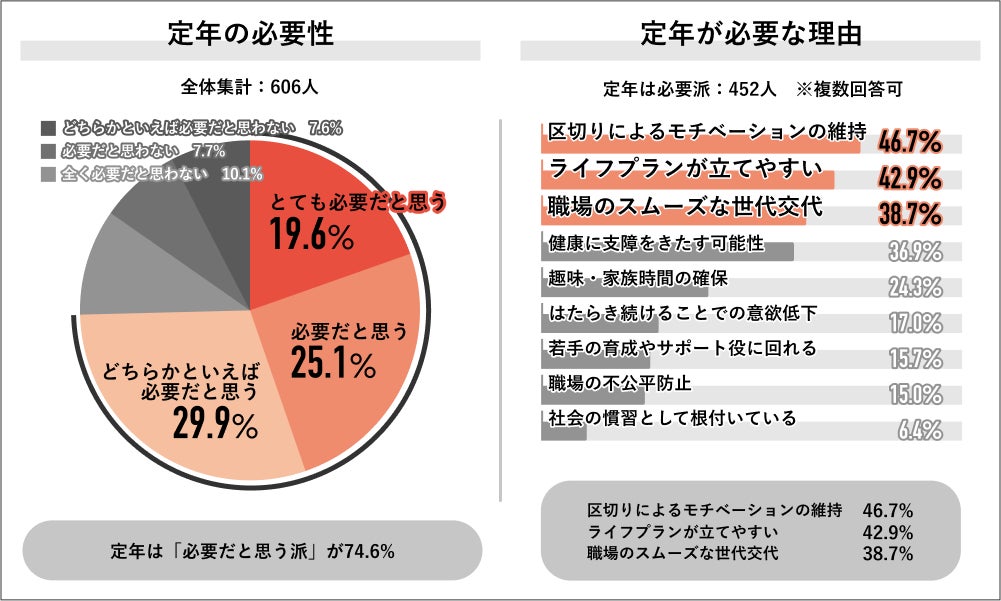 回答者全体の606人に定年の必要性を聞くと、「必要だと思う派」が74.6%で過半数を占め、内訳は「とても必要だと思う」19.6%、「必要だと思う」25.1%、「どちらかといえば必要だと思う」29.9%でした。定年は必要と回答した452人にその理由を聞くと、「区切りによるモチベーションの維持」が46.7%で最多となり、次いで「ライフプランが立てやすい」が42.9%、「職場のスムーズな世代交代」が38.7%でした。