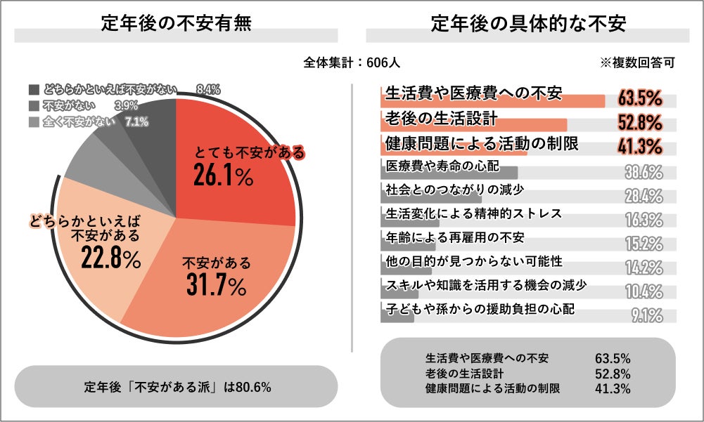 回答者全体の606人に定年後の不安有無を聞くと、「不安がある派」が80.6%で大多数を占め、内訳は「とても不安がある」26.1%、「不安がある」31.7%、「どちらかといえば不安がある」22.8%でした。具体的な不安の内容を聞くと、「生活費や医療費への不安」が63.5%で最多となり、次いで「老後の生活設計」が52.8%、「健康問題による活動の制限」が41.3%となりました。