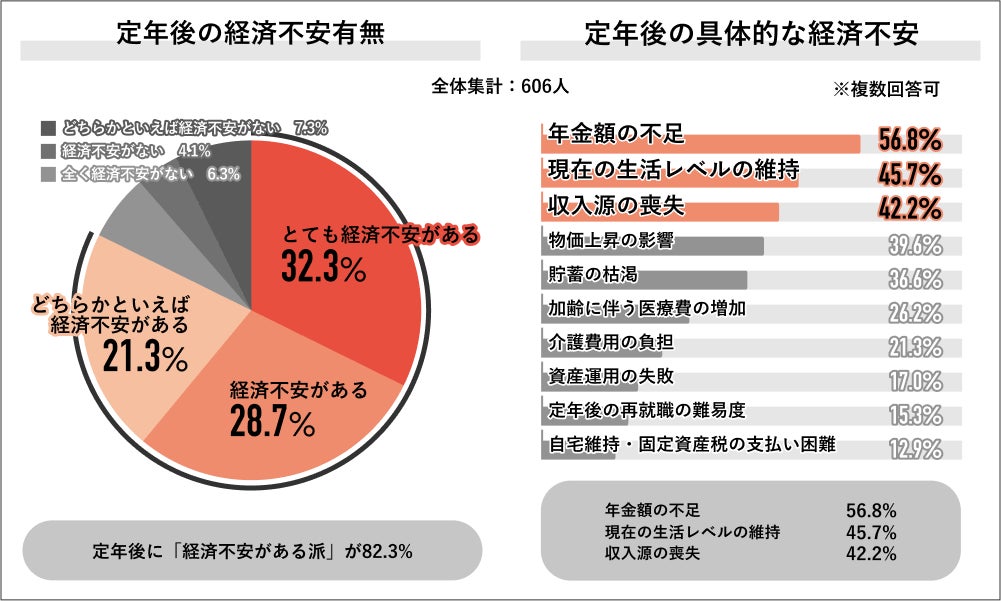 回答者全体の606人に定年後の経済不安の有無を聞くと、「経済不安がある派」が82.3%で大多数を占め、内訳は「とても経済不安がある」32.3%、「経済不安がある」28.7%、「どちらかといえば経済不安がある」21.3%でした。同回答者に具体的な不安の内容を聞くと、「年金額の不足」が56.8%で最多となり、次いで「現在の生活レベルの維持」が45.7%、「収入源の喪失」が42.2%となりました。
