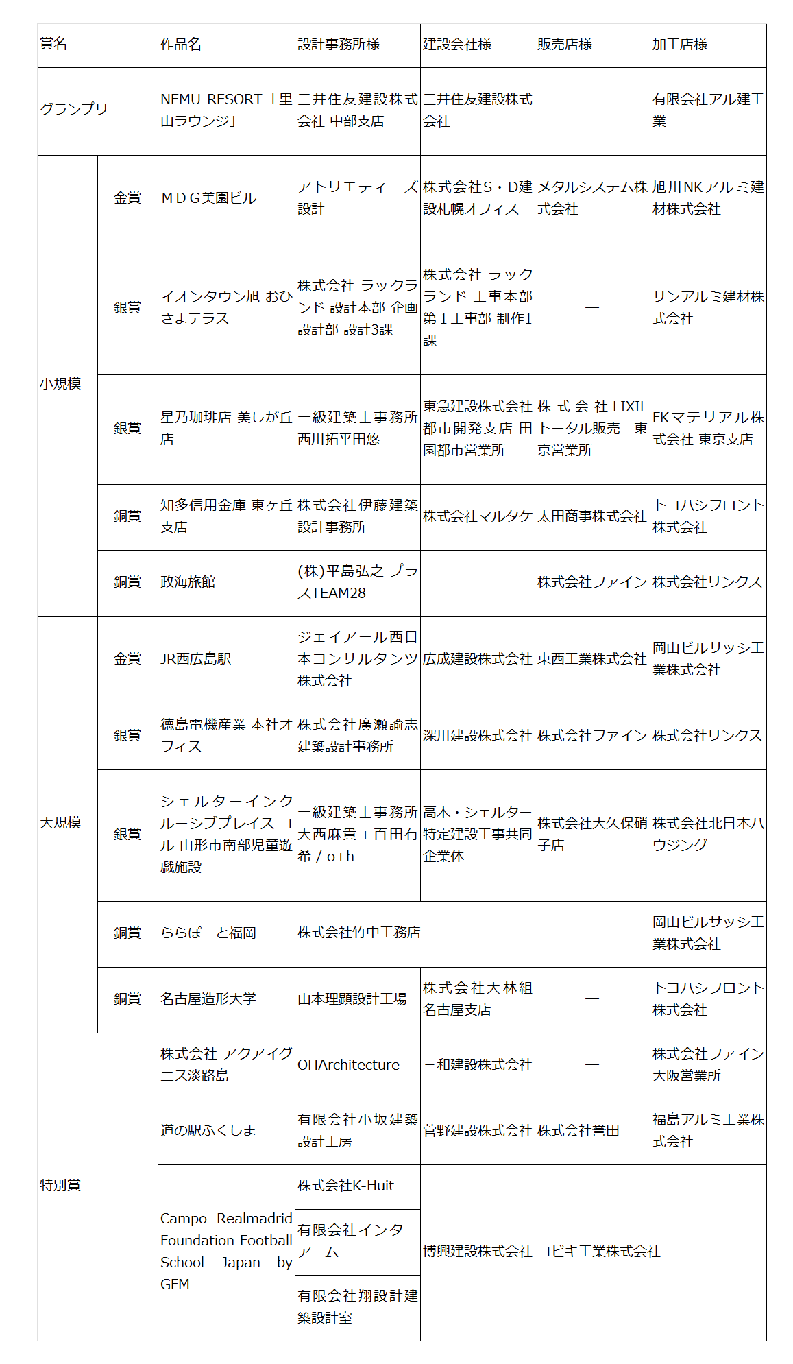 審査は、加工・施工技術、デザイン性、建物全体との調和等を審査基準としており、本コンテストでは、グランプリをはじめ、「小規模部門」「大規模部門」各部門の金賞(2点)、銀賞(4点)、銅賞(4点)ならびに特別賞(3点)を選出しました。