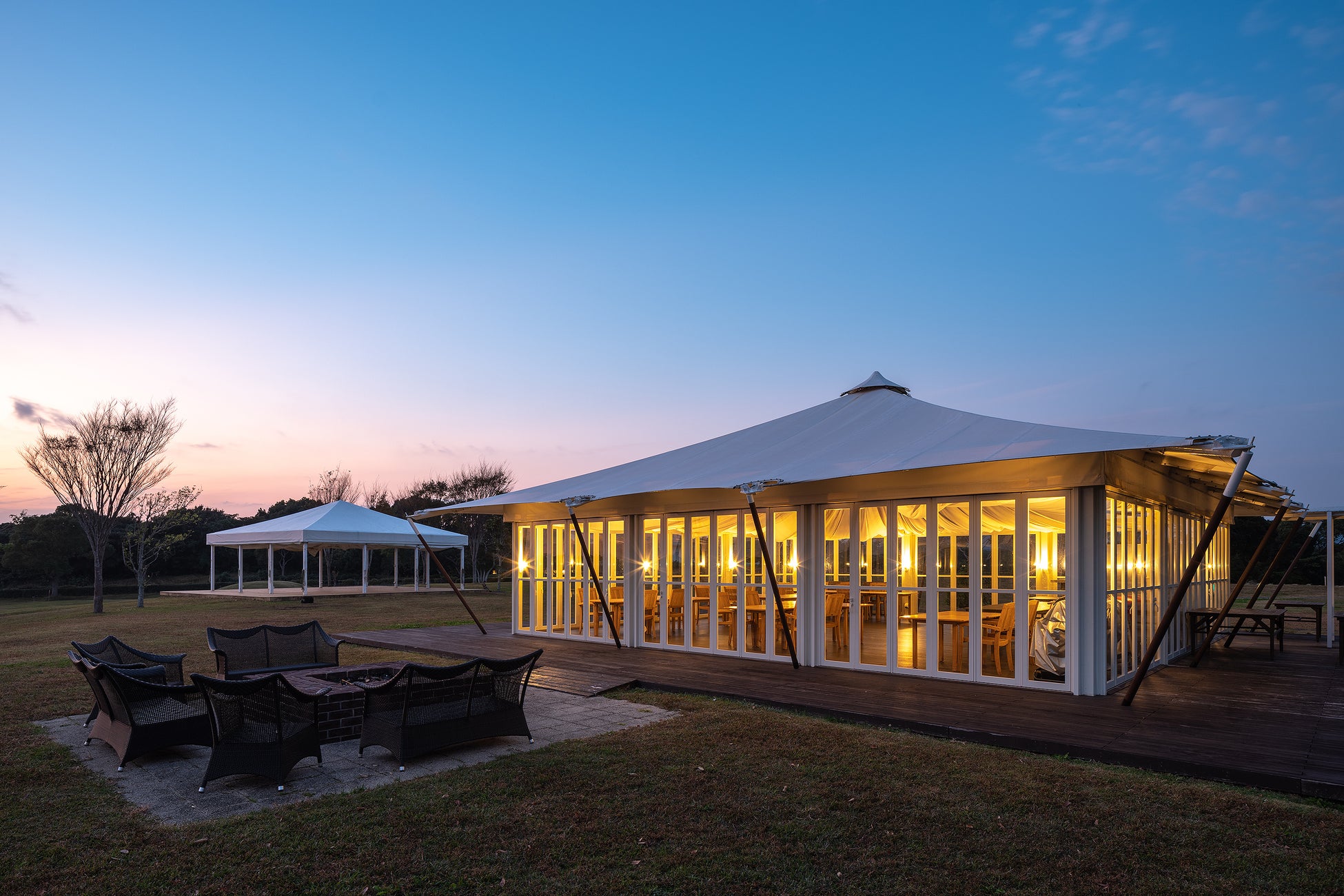 GXの移行を背景に、人工と自然が共存するハイブリッド環境が注目されている。建築・デザイン分野では自然と人工を如何に交配させるか試行錯誤が続き、宿泊や飲食用途におけるグランピング施設の台頭が顕著である。近く竣工する札幌のボールパークでは、日光 風、天然芝などと共にグランピング等の要素が脚光を浴びている。こうした新しい潮流のなかで、究極のグラマラス・キャンピングと呼ぶにふさわしい施設がNEMU RESORT 「里山ラウンジ」である。ここでは最小限の要素で成り立つ建築が、素晴らしい自然の中に並置され新鮮な風景を作り出している。昨今の不動産開発や建築設計の原理は、床をつくり専有や共有の権利を付与する。屋根をつくり雨や日光を凌ぐ。壁をつくり風、音、温度をコントロールする。こうした施設は大屋根の基に内外の環境を操作するなど大規模ゆえに多大な環境負荷をかけている。これら建築要素の組み合わせを分解して小規模に再構成したのがこのグランピングだ。当該物件は壁面や開口部の仕組みを最小化することで実に爽快なハイブリッド環境の新たな価値を創造した。重要な点は多様なニーズに柔軟に対応する折れ戸 ラクタスシリーズが開口部の機能を無限に拡張した点だ。開口を巧みに操作することで、価値や用途を変容させ、利用する人々のUX(ユーザーエクスペリエンス)による体験価値を高めた。更に、軽い構造による有期限の運用計画等々ハイブリッド効果を最大化した点が非常に優れている。今後GXを目指した施設建築が重要性を増すなか、当該物件はこうした流れの魁として、グランピング環境の優位性を示唆している。これを可能にした折れ戸による先進的な開口部のデザインは審査委員から高く評価されグランプリ作品に採択した。 |