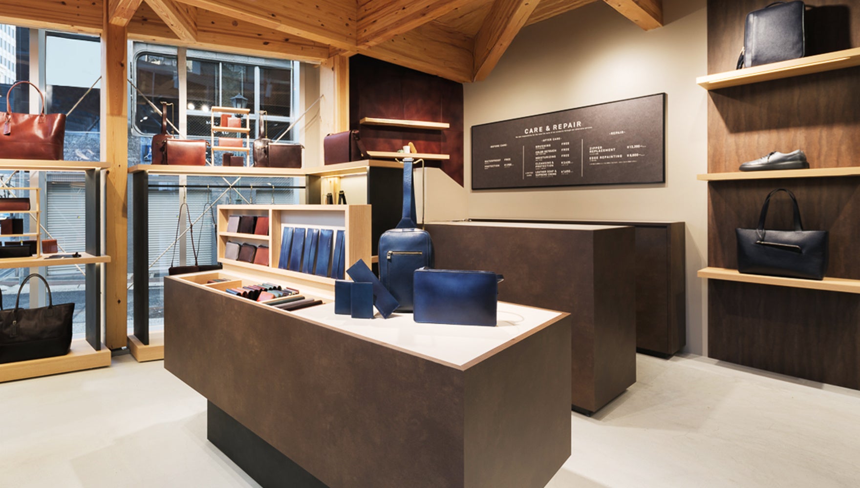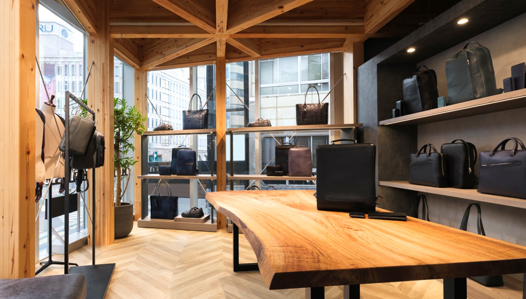 店内テーブルには、兵庫県の県樹・クスノキを使用。マザーハウス最初の生産国であるバングラデシュのレザーもかけあわせ、神戸らしさとマザーハウスらしさが重なり合う、兵庫初となるメンズ専門店が誕生しました。