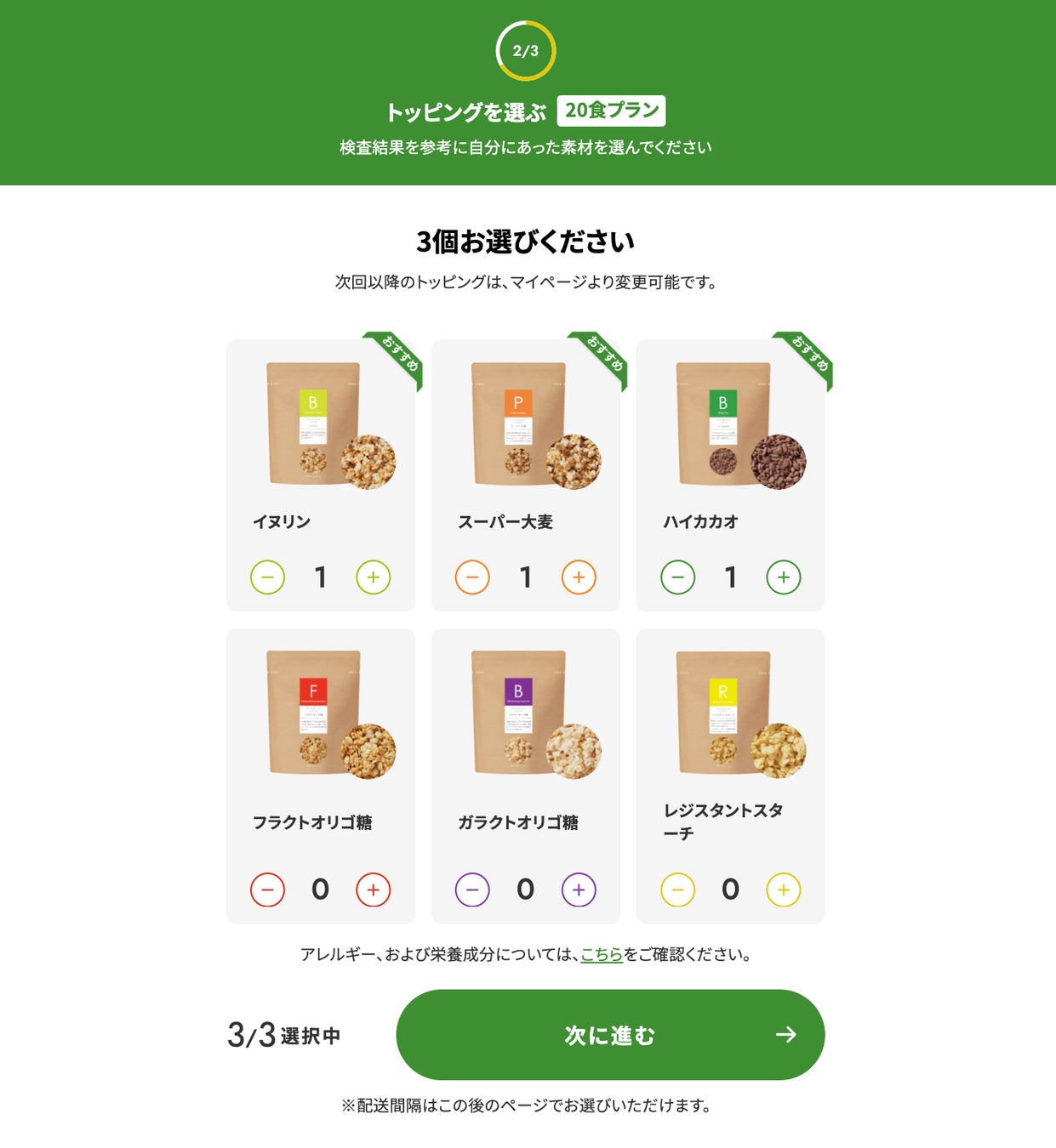 現在は、ecforceの「セット販売機能」を活用して、ベースグラノーラと好みのトッピングを3つ選択できるようになっています。マイページ画面からグラノーラを購入する際、検査結果に応じて自分に合ったトッピングがデフォルトで選択されるようにしていますが、お客様の好みに合わせて選択し直すことも可能です。