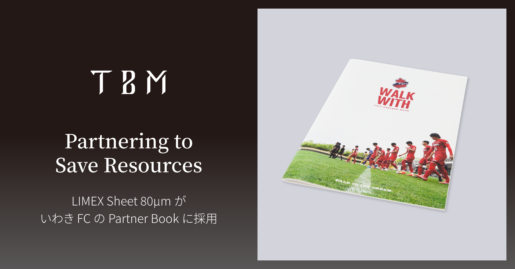 株式会社TBM(本社:東京都千代田区、代表取締役CEO:山﨑敦義、以下TBM)は、日本プロサッカーリーグ(Jリーグ)に加盟するプロサッカークラブ「いわきFC」の2021パートナーブック「WALK WITH」に、石灰石を主原料とする「LIMEX Sheet(ライメックスシート)」80μm(白色ソフト)が採用されたことをお知らせいたします。