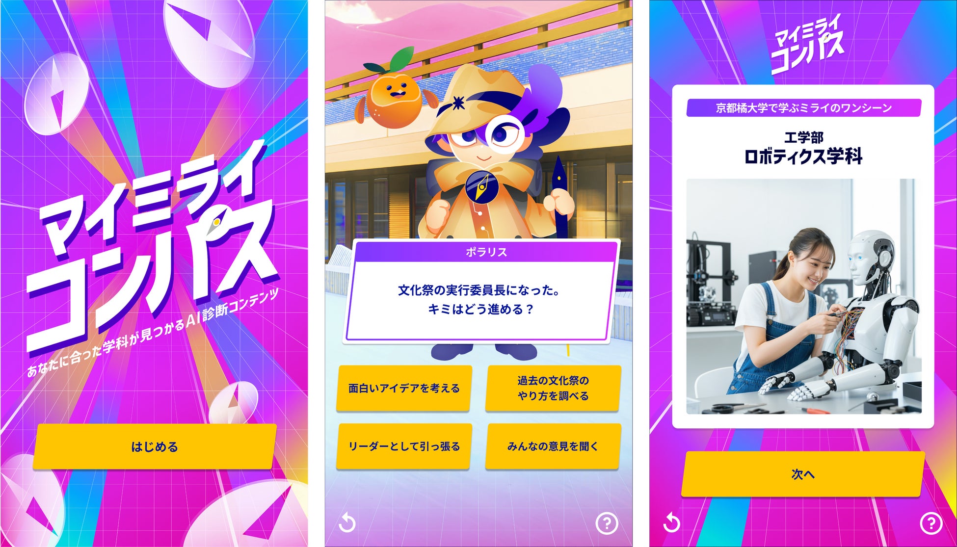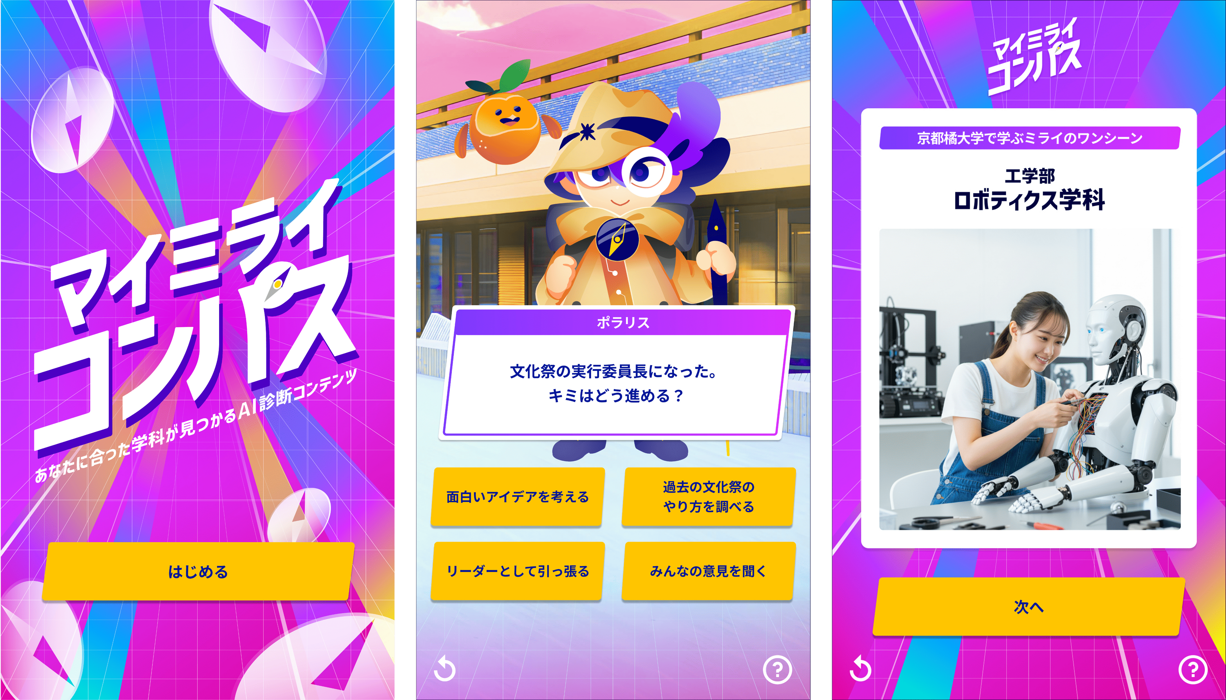 「マイミライコンパス」は、画面上の質問に答えることで興味・関心や志向性を整理し、京都橘大学の18学科の中から自分に合った学びの領域をレコメンドする体験型デジタルコンテンツです。