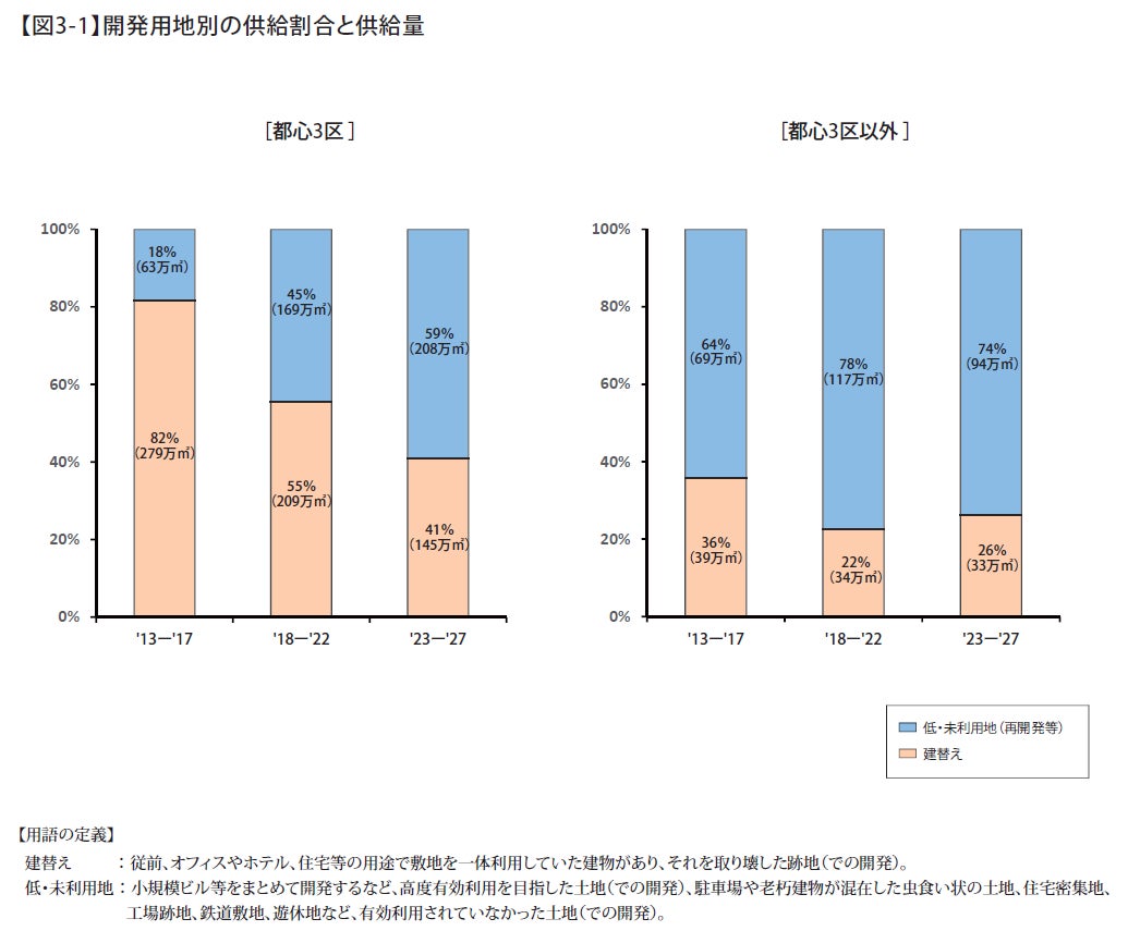 都心3区では、’13-’17年には8割であった「建替え」の割合が、’23-’27年には半減して4割まで低下する。開発用地の主体が「低・未利用地(再開発等)」へとシフトしている。一方、都心3区以外では、’13年以降継続して「低・未利用地(再開発等)」が開発主体になる。