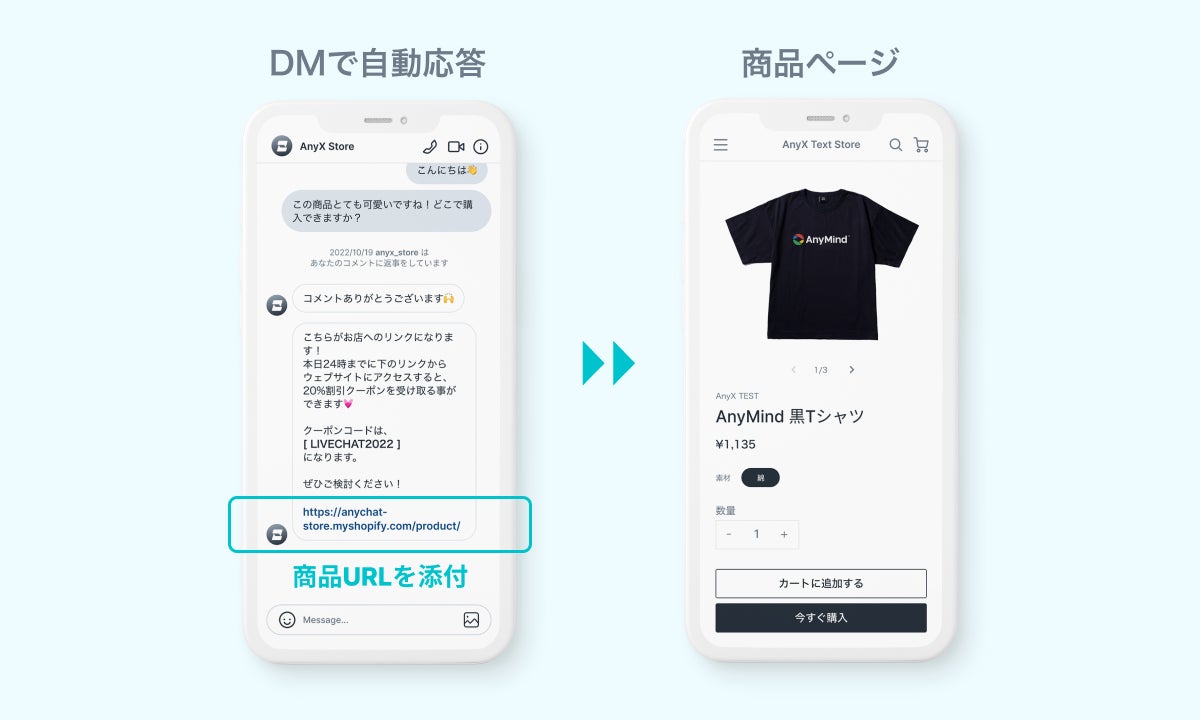 今回のInstagram連携・新機能により、ライブコマース実施時の視聴者からのコメントをきっかけとした商品ページのURLやクーポンコード配布の自動化が可能となり、Instagramライブから商品サイト導線確保による購買数の増加を図ることができます。