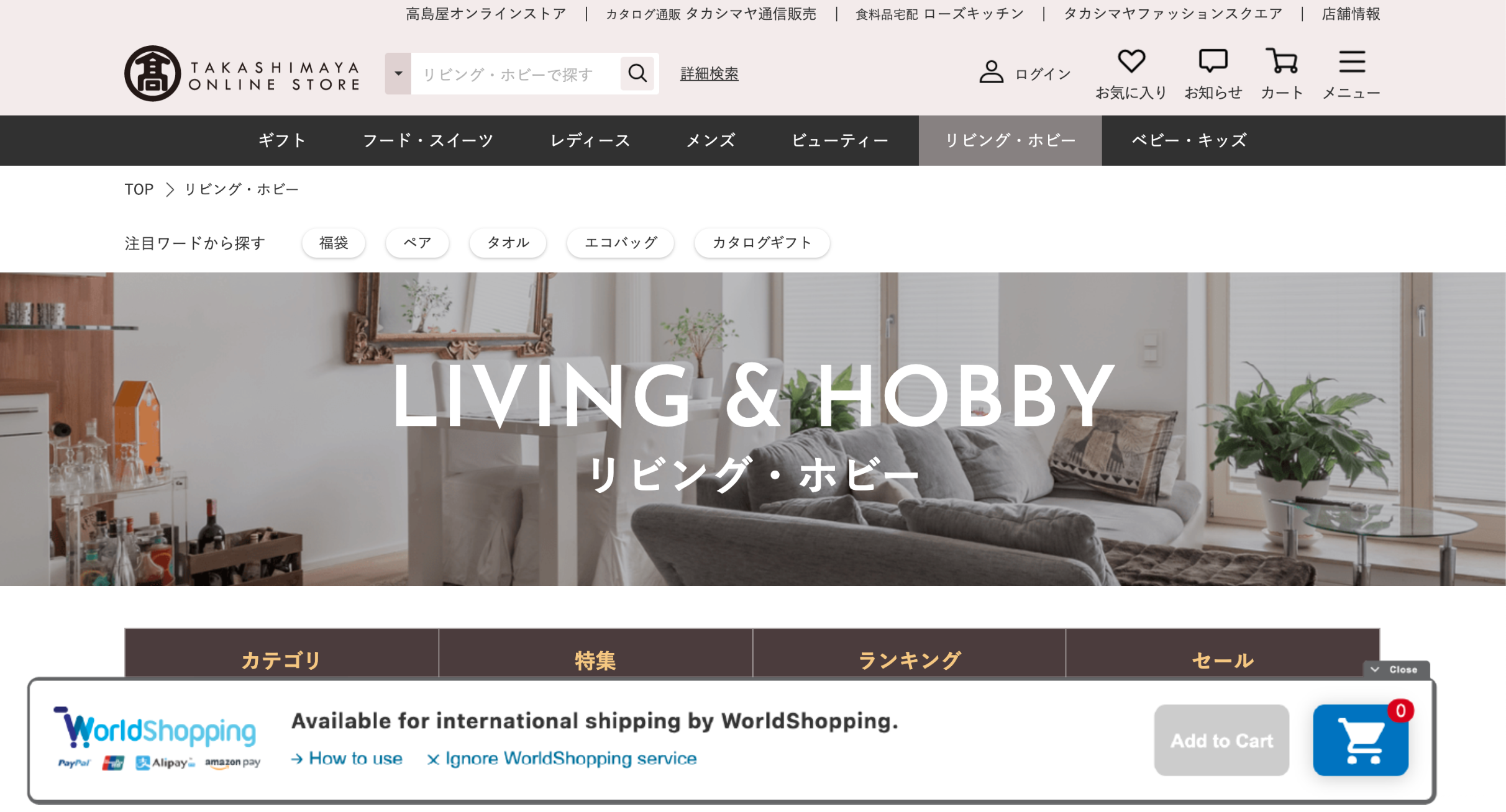 髙島屋オンラインストアでは、店舗でウインドーショッピングを楽しむ感覚でサイト内を楽しく回遊できるよう、衣食住のジャンルをまたいだライフスタイル型の商品提案を強化するとともに、髙島屋バイヤーが厳選した商品を豊富に取り揃えています。 『WorldShopping BIZ』ではリビング・ホビー、ファッション、ベビー・キッズのジャンルを中心に展開してまいります。