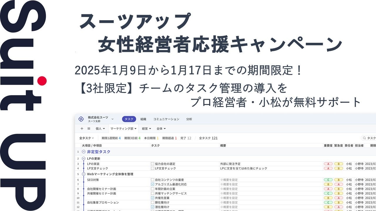 2025年1月9日から17日までの期間に、スーツアップの無料お試し30日にお申込みいただきました女性が経営者を務める企業様のうち3社限定で、当社代表者であり中小・中堅企業やスタートアップのバリューアップに実績のあるプロ経営者の小松自ら、チームのタスク管理の導入サポートを無料で行うキャンペーンを実施します。