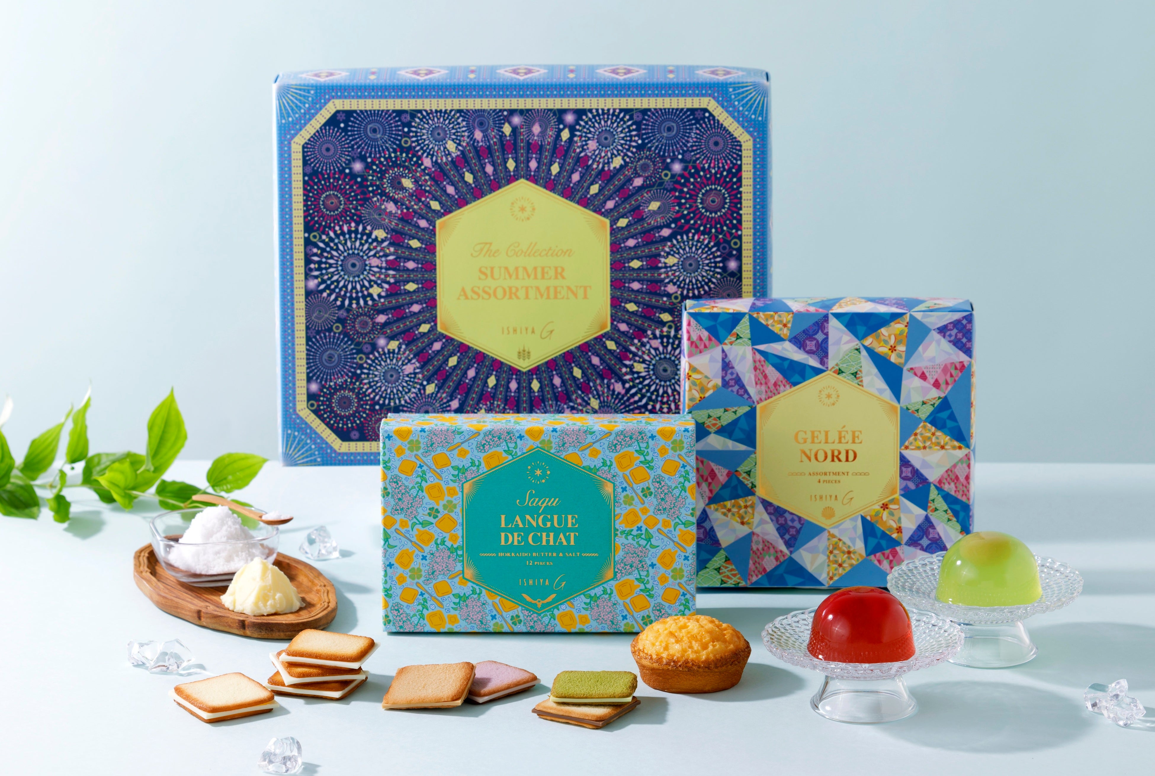 ISHIYA Gの看板商品「サク ラング・ド・シャ」の期間限定フレーバーを含む7種と、「アイガトー(プレーン)」、夏限定商品を詰め合わせた今だけのアソートです。一箱でISHIYA Gの夏限定商品がすべて楽しめます。