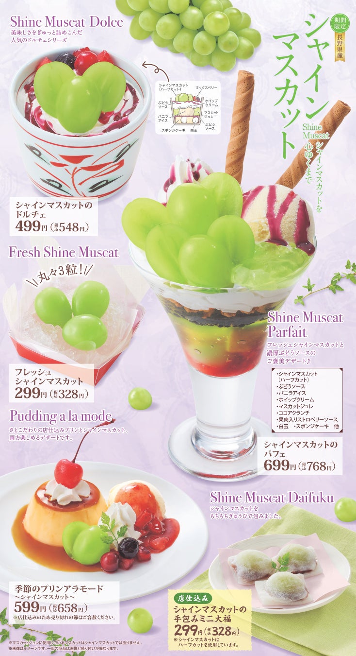 今回は長野県産のシャインマスカットを使用し、豪華なパフェや人気の「ドルチェ」シリーズ、そして季節のプリンアラモードなど、今しか楽しめない旬のデザートが新登場♪