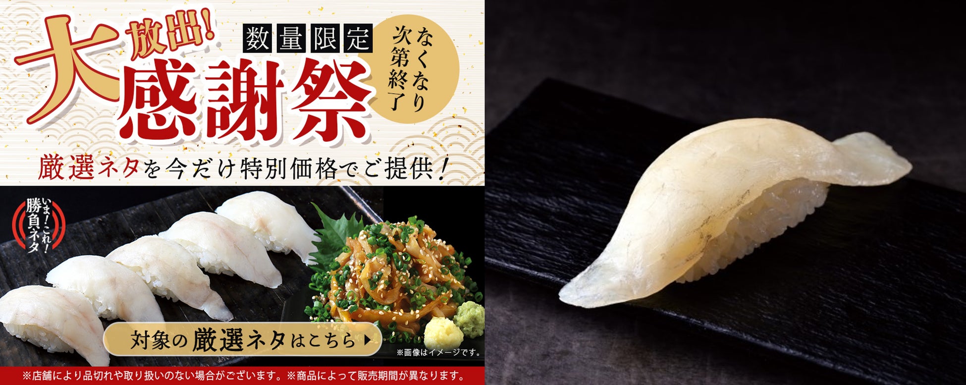 2月に創業月を迎える「銀のさら」において、日頃よりご愛顧いただいている皆さまに感謝を込めて、この時期おすすめのネタを特別価格で販売する『大放出感謝祭』を開催いたします。「銀のさら」公式WEBサイト(https://www.ginsara.jp/)限定販売となります。