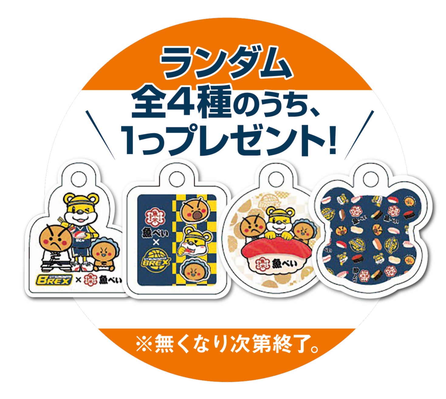 全国の魚べい、元気寿司にて対象のコラボ商品「宇都宮ブレックス ヴィクトリーセット」をご注文いただくと、オリジナルアクリルキーホルダーをランダムで1種プレゼントいたします。