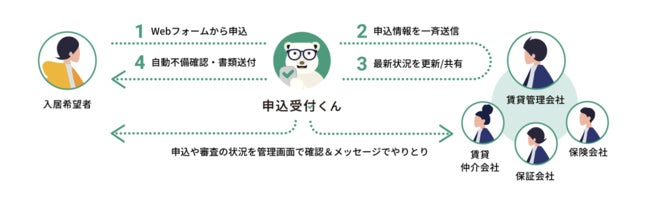 賃貸の入居希望者による申し込みプロセスを、賃貸不動産管理会社、賃貸不動産仲介会社、家賃債務保証会社、保険会社などと連携し、オンラインで完結するWEB申込受付システムです。昨年比80%増の年間約63万件の電子申込を実施し、国内の賃貸申し込みの電子化を促進しているサービスです。