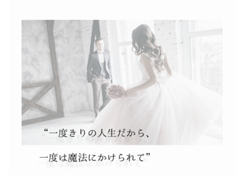 | 私たちは、「一度きりの人生だから、一度は魔法にかけられて」というコンセプトのもと、「これから花嫁さまになる女の子も、独身でも、おばあちゃんでも、ただ“ウェディングドレスを着てみたい“を叶えたい」という思いで、サービスを運営しております。 昨今の新型コロナウイルス感染症の流行により、結婚式を中止・延期・規模縮小された方や、ウェディングフォトの日程変更・急遽実施でお困りの方から多くのご相談を受け、何ができることはないかと常に考えてまいりました。限られた予算や準備期間のなかでも高品質なウェディングドレスを着ていただきたい、そしてウェディングフォトの撮影やお食事会を心から楽しんでいただきたいという想いで、着用回数に制限のない、長期のレンタルサービスをスタートするに至りました。 結婚を決め、新しく一歩踏み出すおふたりはもちろん、1人でも多くの方に「ウェディングドレス」を通して幸せを届くよう願っております。 |