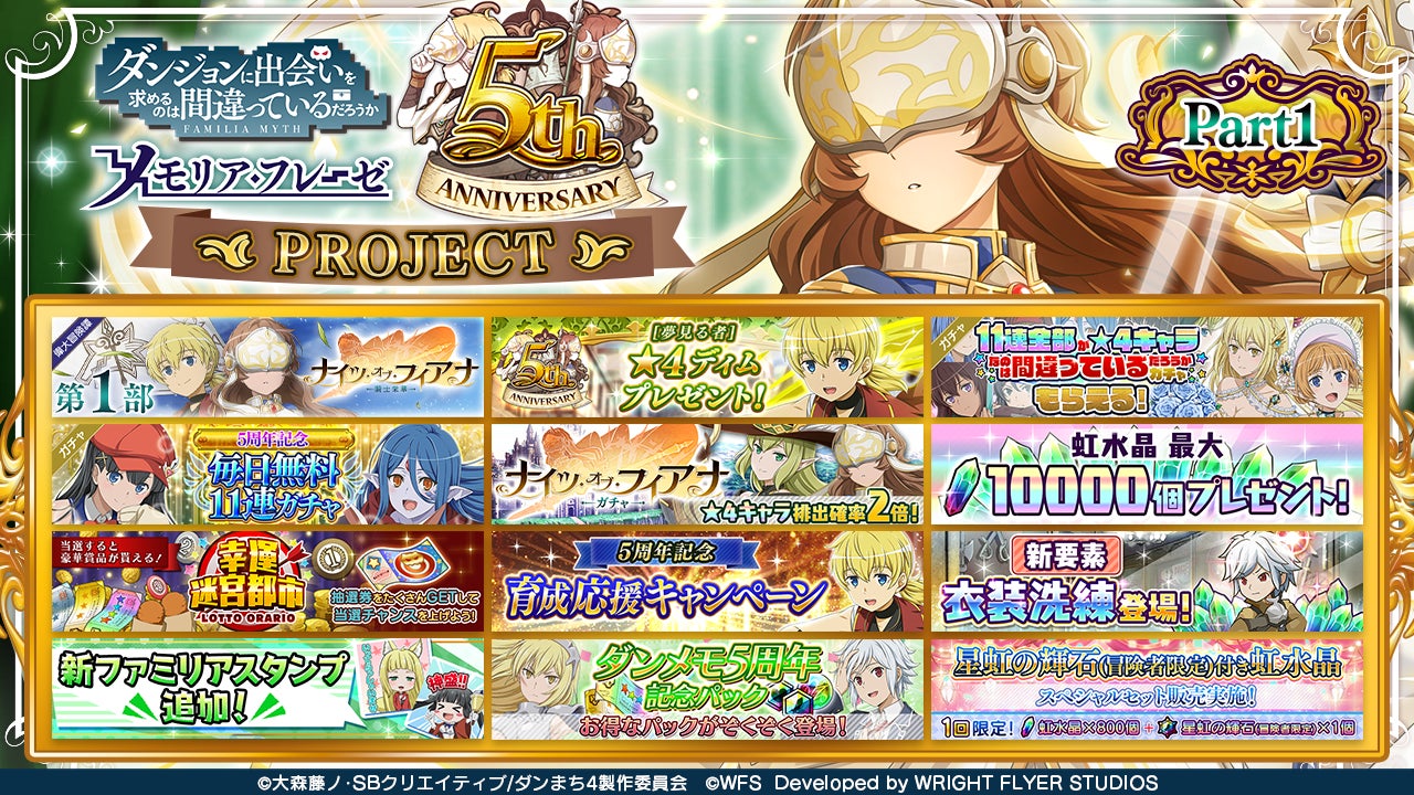 株式会社WFS(本社:東京都港区、代表取締役社長:柳原 陽太、グリー株式会社100%子会社)が、App Store、Google Play(TM)で配信中の「ダンジョンに出会いを求めるのは間違っているだろうか〜メモリア・フレーゼ〜」(以下、ダンメモ )は、リリース5周年を記念し、原作・大森藤ノ 書き下ろしによるオリジナルシナリオ「ナイツ・オブ・フィアナ」を6月23日(木)よりフルボイスで配信開始しました。