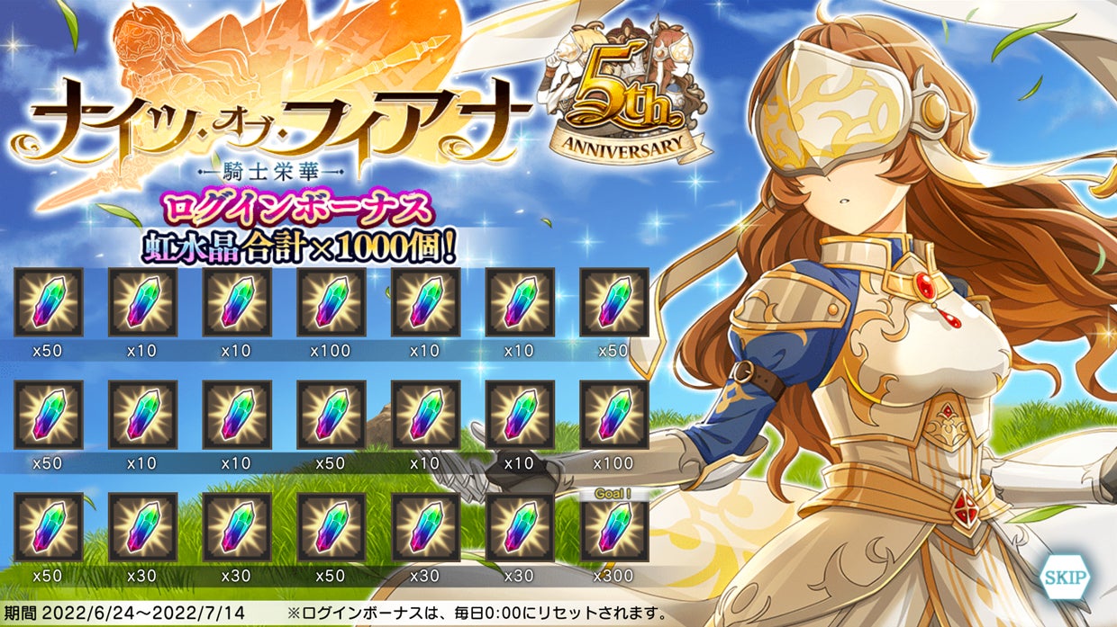 6月23日(木)以降の初回ログインで虹水晶1,000個をプレゼントし、偉大冒険譚「ナイツ・オブ・フィアナ」開催を記念したログインボーナスに参加すると、第1部、第2部、第3部それぞれで虹水晶が合計1,000個ずつもらえます。