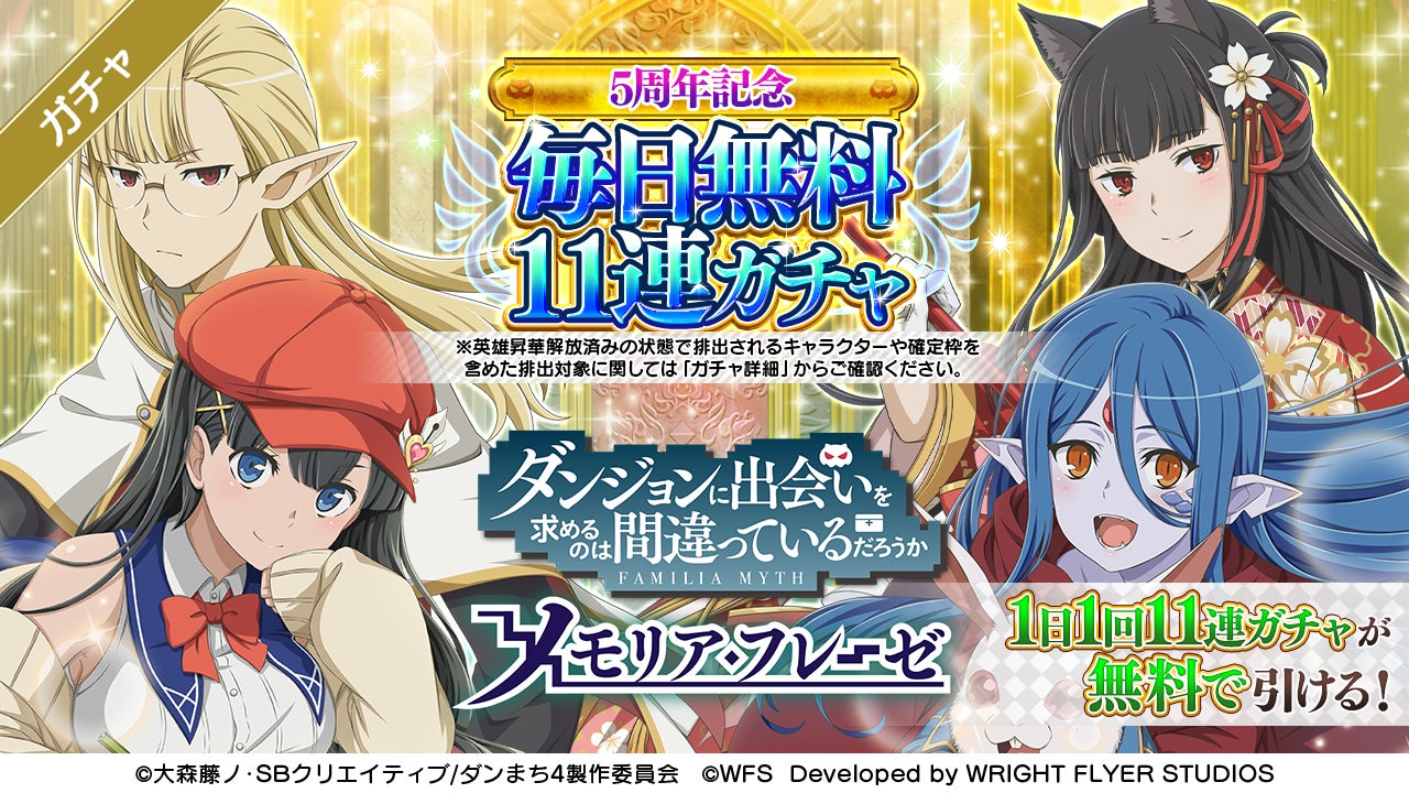 「ダンメモ」のリリース5周年を記念して、毎日無料11連ガチャキャンペーンを開催します。