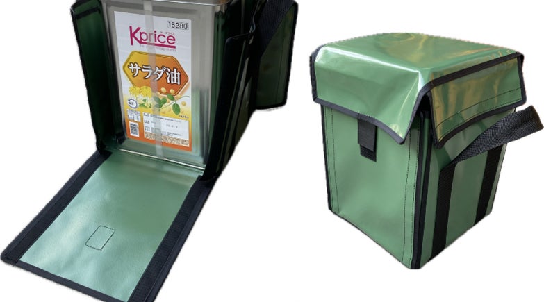 今回、廃食用油の回収を開始するにあたり、専用カバーを開発しました。一斗缶での回収時には、このカバーを利用することで、運搬時の漏れなどを防ぐことができます。