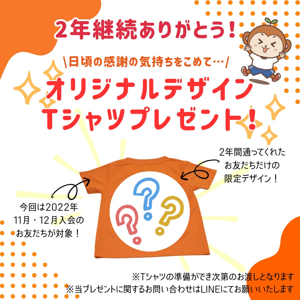 【姫路】体操教室・おさるの森キッズラボ2周年記念!継続会員様へオリジナルTシャツをプレゼント