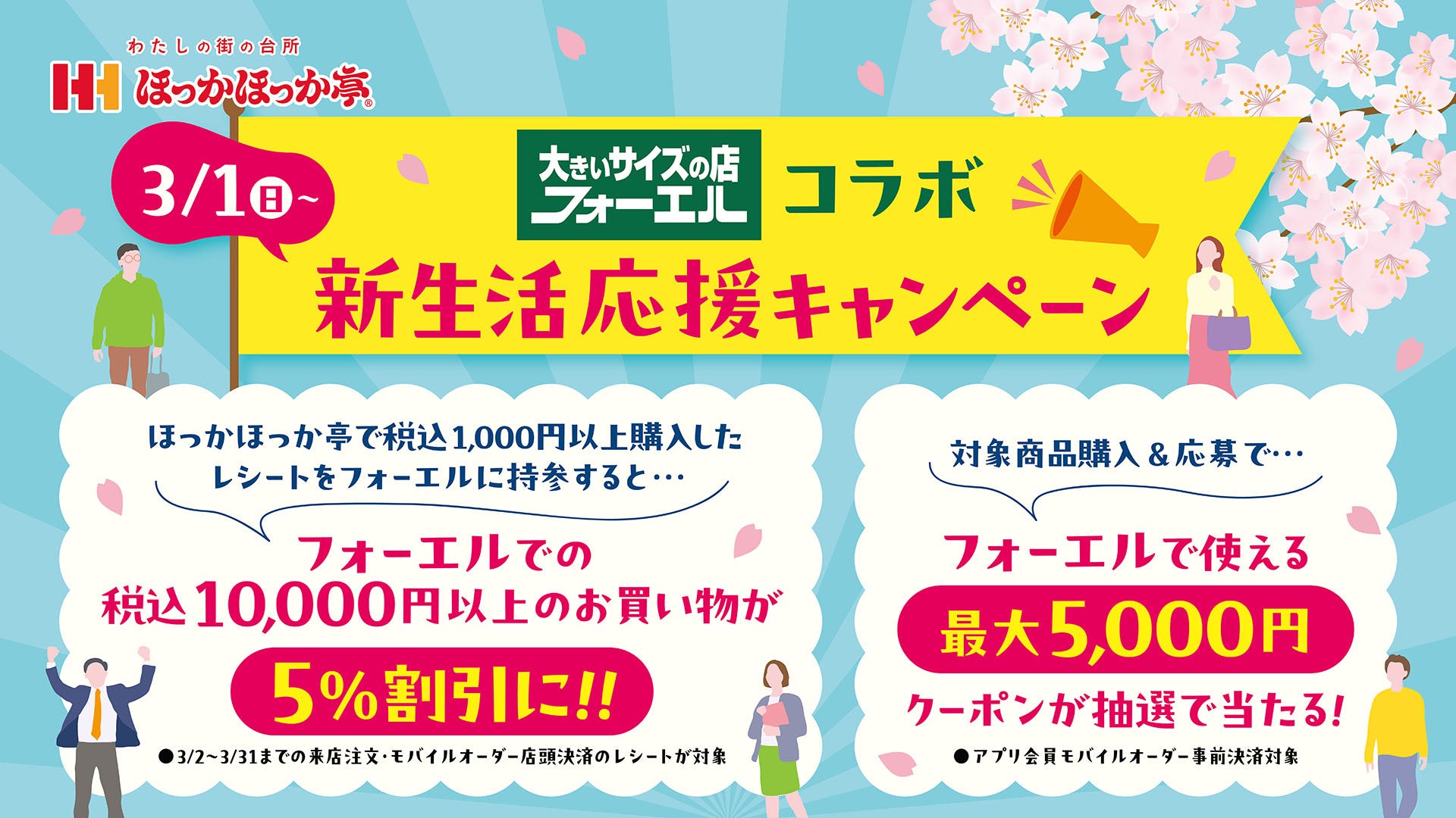 ・内容:ほっかほっか亭で「来店」もしくは「モバイルオーダー(店頭決済)」にて、1会計1,000円(税込)以上ご購入時のレシートをフォーエル店舗へ持参し、10,000円(税込)以上のお買い物で5%割引