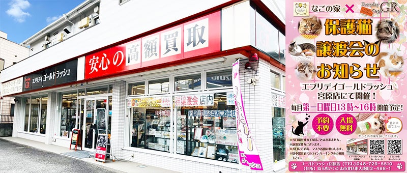 お客様が飼っているもしくは飼っていた猫の想い出やエピソードをお聞きし、その際に売って下さったお品物に猫の想い出査定として500円買取金額をアップする。そのアップした買取金額500円分はゴールドラッシュ全店舗に設置されている保護猫募金箱にお客様に入れていただきます。その募金箱に溜まった募金額は、全てエブリデイゴールドラッシュ宮原展とタイアップし保護猫譲渡会を行っている「なごの家」に寄付され、保護猫の保護に必要な「餌」や「グッズ」などの資源にします。