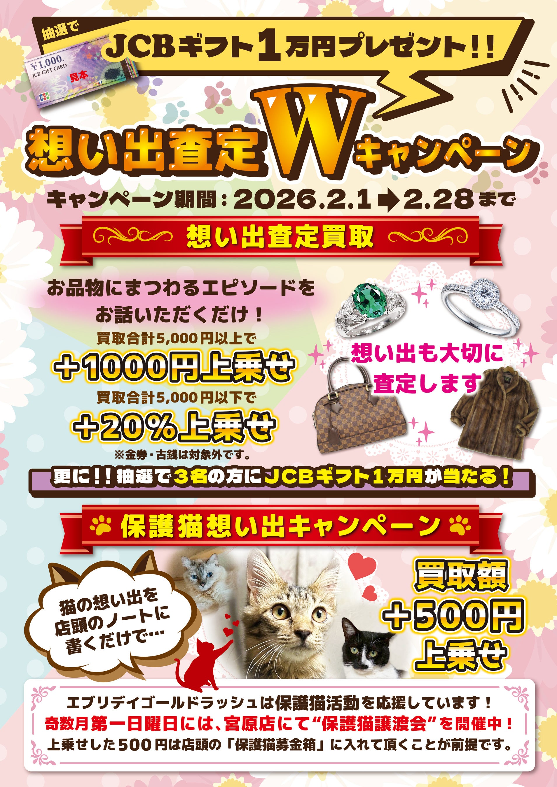 想い出査定で有名なリサイクルショップの「エブリデイゴールドラッシュ」を運営する(埼玉県桶川市/代表取締役中村秀夫)は、2026年2月1日(日)から2月28日(土)まで、自社独自の査定方法である、想い出査定と保護猫想い出査定で、「お客様のお品物の想い出」や「飼っている猫とのエピソード」を聞き、想いの丈分、査定額をアップする企画を開催致します。