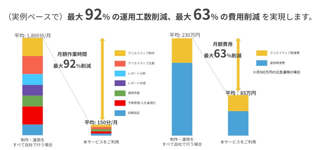 さらにペルソナの設定からクリエイティブの制作、広告運用にかかる工数を最大92%もの削減、自動運用により広告運用費の63%の削減を実現し、人員の少ない企業でもご活用いただけます。