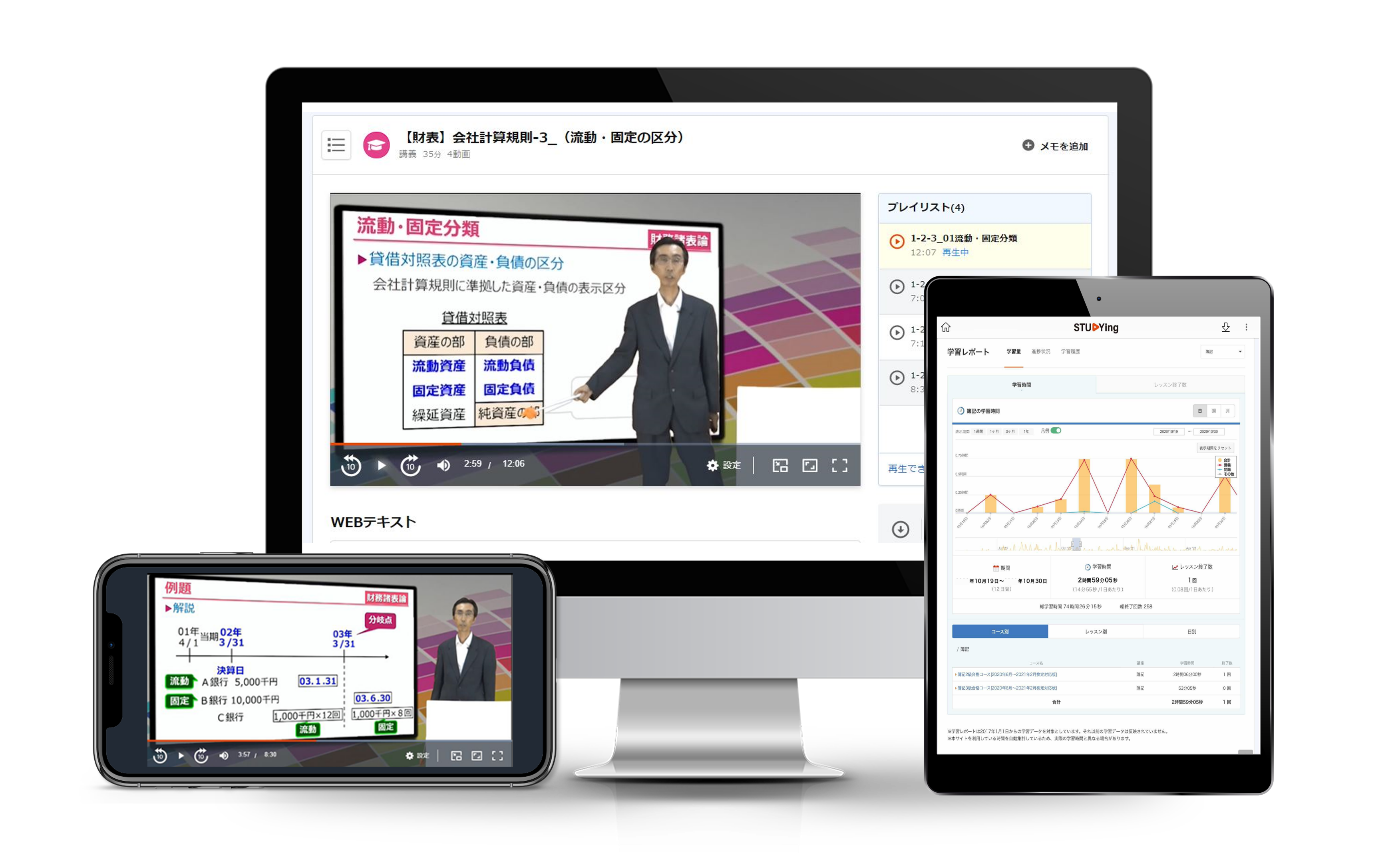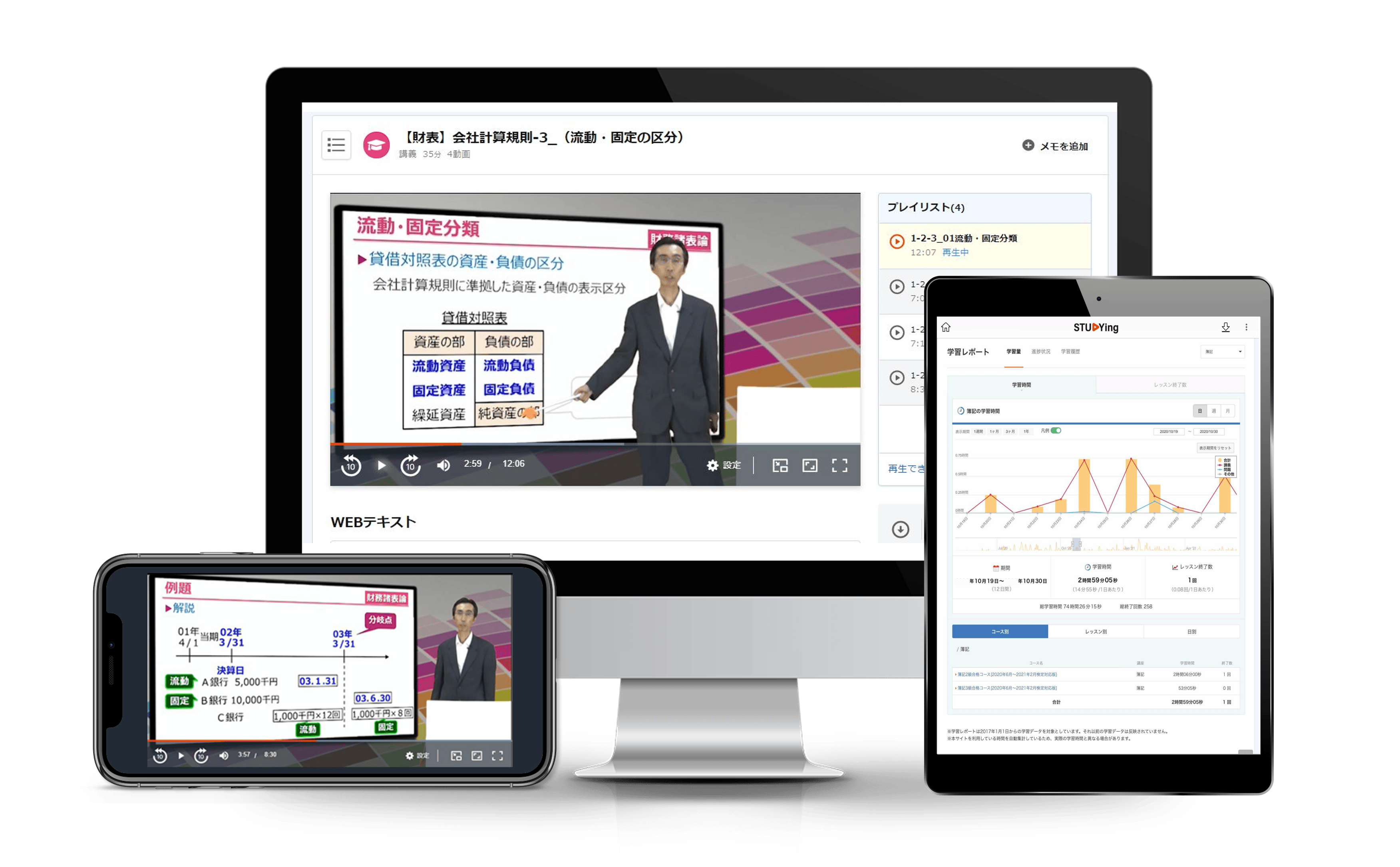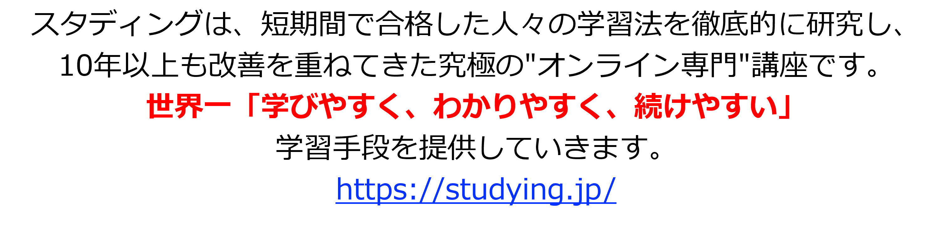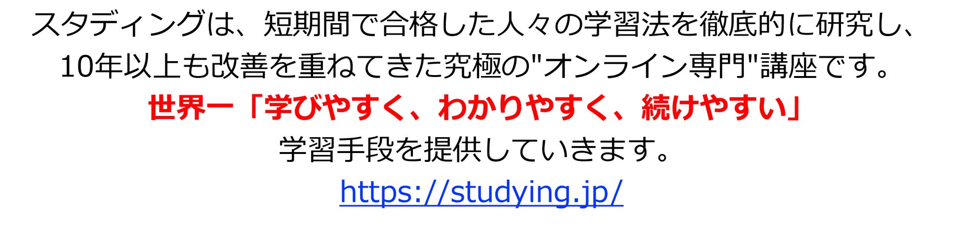 「スタディング」( https://studying.jp/ )は、短期間で合格した人々の学習法を徹底的に研究し、10年以上も改善を重ねてきた究極のオンライン資格取得講座です。