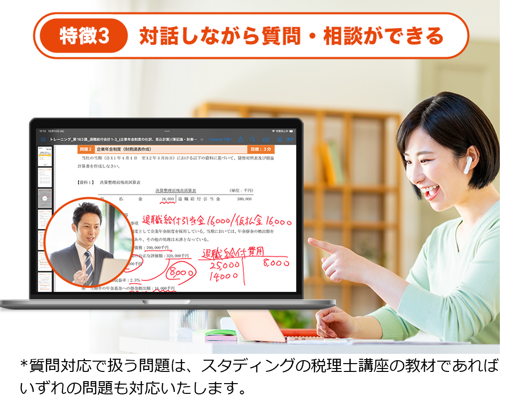 さらに大手予備校での税理士講座においては、パッケージ内容(指導内容の充実度)に応じて25万円~40万円程度*の受講料で提供されておりますが、スタディングでは全てのオンライン対策講座と質問サービス、個別指導までをフルパッケージしたコースで199,800円(税込)と、大手予備校に比べて取り組みやすい低価格でご提供させていただきます。 自分のペースで効率的に学習できる従来のオンライン講座に加えて、講師によるきめ細かなサポートを実現することで、低価格でありながら税理士試験受験生の合格を強力にサポートします。