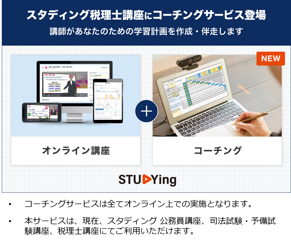 オンライン資格取得講座「STUDYing(スタディング)」を提供するKIYOラーニング株式会社(東京都千代田区、代表取締役社長:綾部貴淑)は、税理士講座で講師による1対1の個別指導が受けられるコーチングサービス提供を1月4日より開始しました。コーチングサービスでは、講師が受講生個人に合わせた学習計画を提案し、学習の進捗管理や質問対応など、モチベーション維持と試験までの学習を継続するためのサポートを行います。それにより、オンライン講座をより効率的・効果的に活用いただけるようになります。