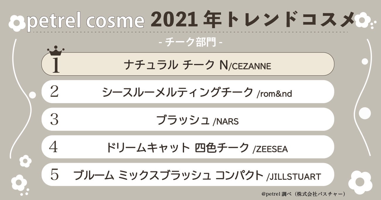 2位以下は全体的にツヤ感のあるチークが多くランクインしています。2021年は肌が潤ったように見える艶メイクが流行していたようです。