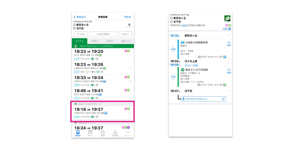 今回の対応では、ユーザーごとのアプリの利用状況や経路の評価に基づいてルートを算出し、ルート検索時に、それに応じた「あなたへのおすすめルート」を提案いたします。