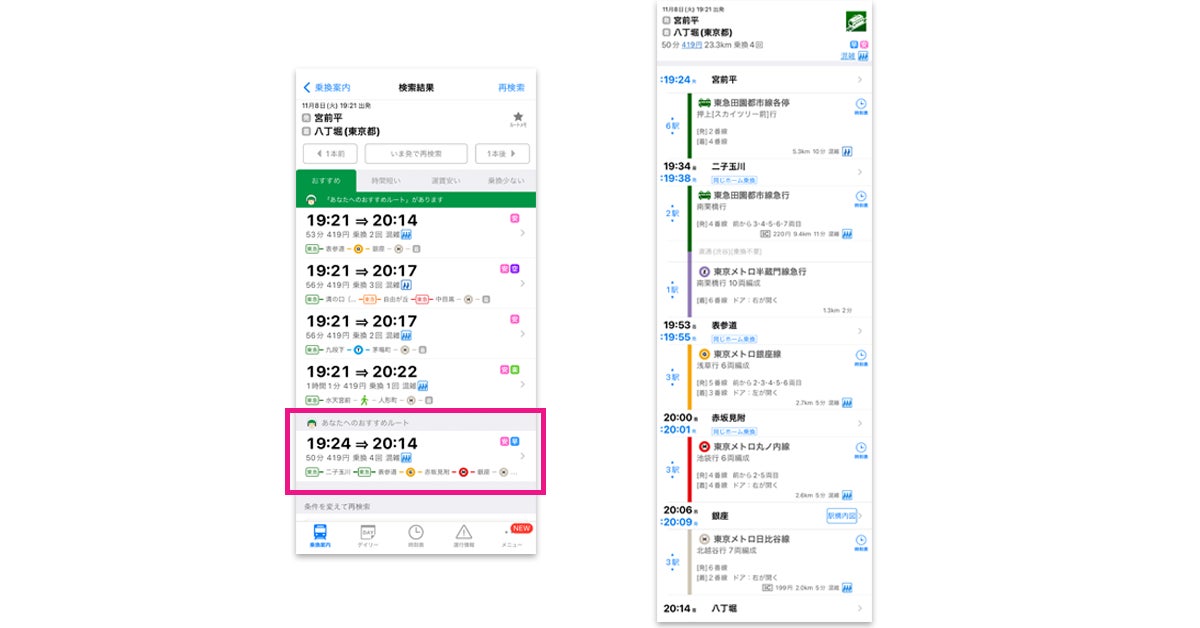 出発地から目的地までの乗換検索をすると、通常の検索結果(最大4件)に加えて、該当ルートがある場合に1つもしくは2つのルートが提案され、最大6ルートから比較して選ぶことができます。お客さま側の特別な設定は不要で、ルート検索時に候補となるルートがある場合に自動で表示されます。