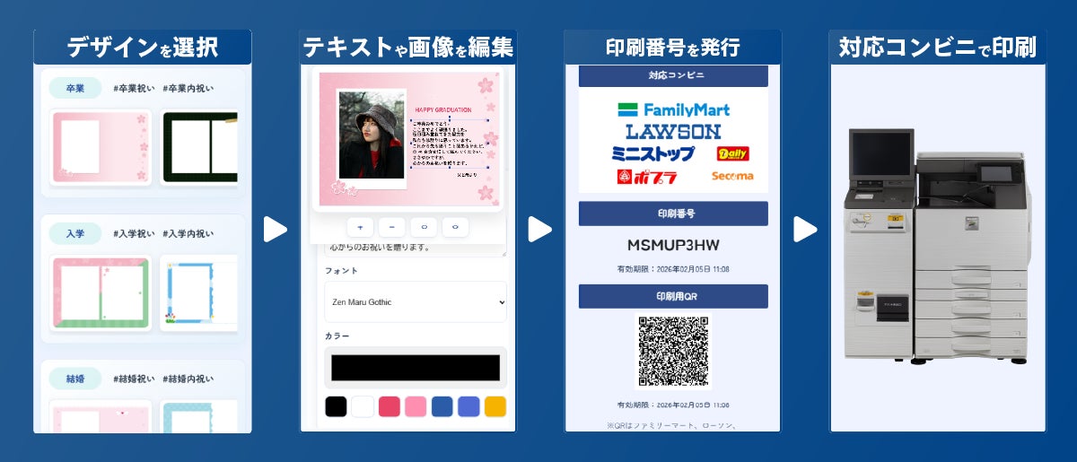 本サービスは、ブラウザ上でデザインからメッセージ入力まで完結し、作成後は全国約30,000店舗のコンビニエンスストアで即日印刷が可能なプリントサービスです。
