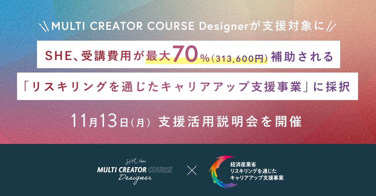 SHE、受講費用が最大70%(313,600円)補助される「リスキリングを通じたキャリアアップ支援事業」に採択